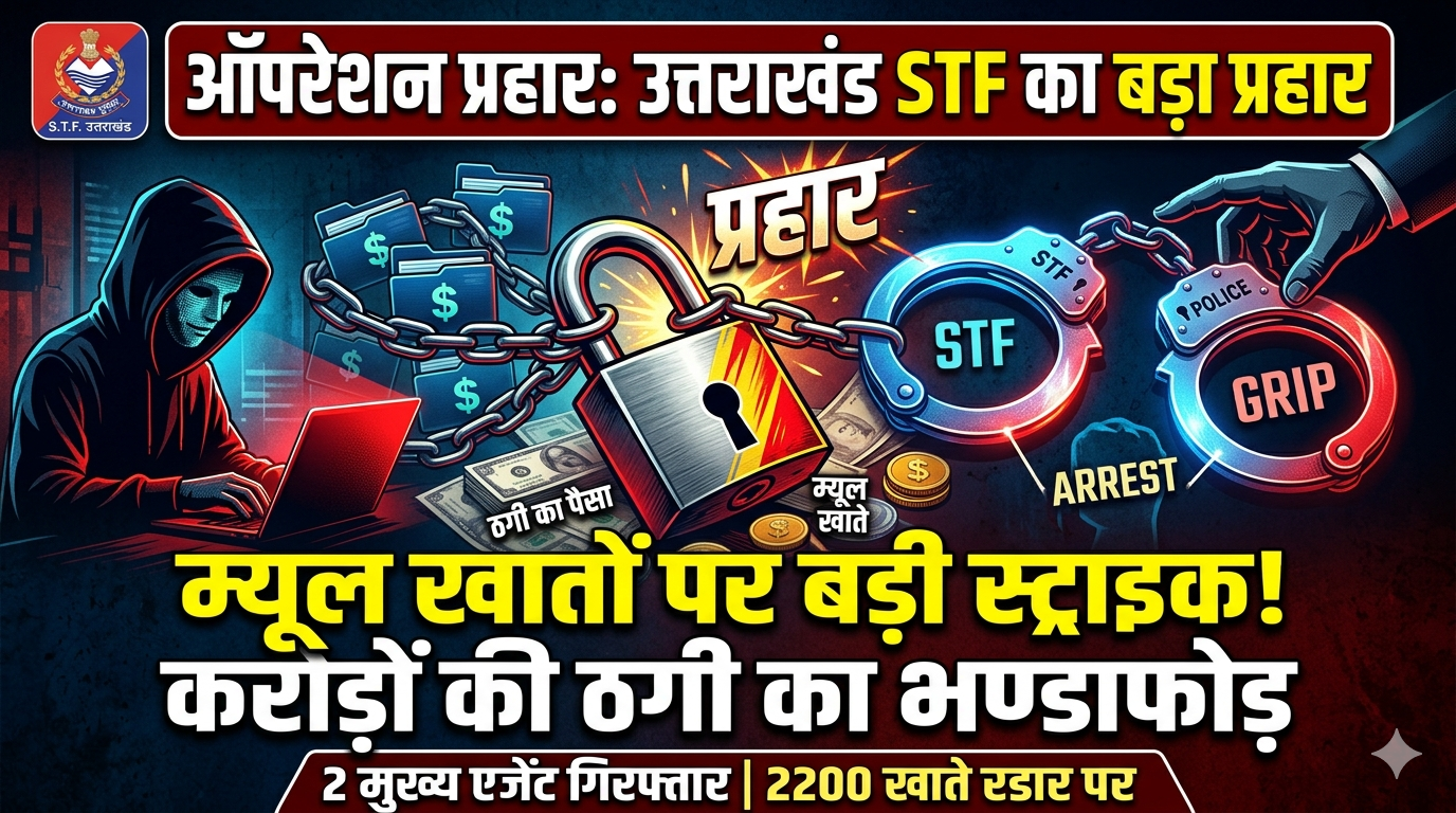 न्यूज एंड नॉक ब्यूरो, देहरादून।  साइबर अपराधियों के खिलाफ स्पेशल टास्क फोर्स ने एक बड़ा अभियान छेड़ा है। मुख्यमंत्री के अपराध मुक्त उत्तराखंड मिशन के तहत एसटीएफ ने ‘ऑपरेशन प्रहार’ के जरिए राज्य में संचालित 15 संदिग्ध म्यूल बैंक खातों पर बड़ी कार्रवाई की है। इस कार्रवाई के दौरान पुलिस ने गिरोह के दो प्रमुख एजेंटों को गिरफ्तार किया है और करोड़ों रुपये के संदिग्ध लेनदेन का खुलासा किया है।